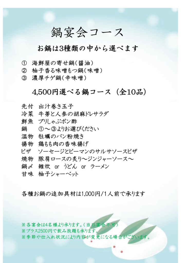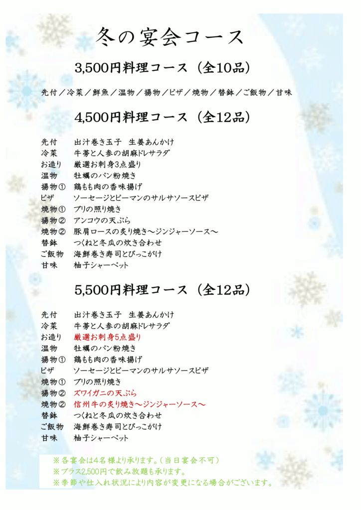 本格的な冬の到来を迎え、黒船 佐久平店では、皆様の忘年会や新年会、各種お集まりに最適な「冬の宴会コース」と、心も体も温まる「鍋宴会コース」の提供を開始いたしました。