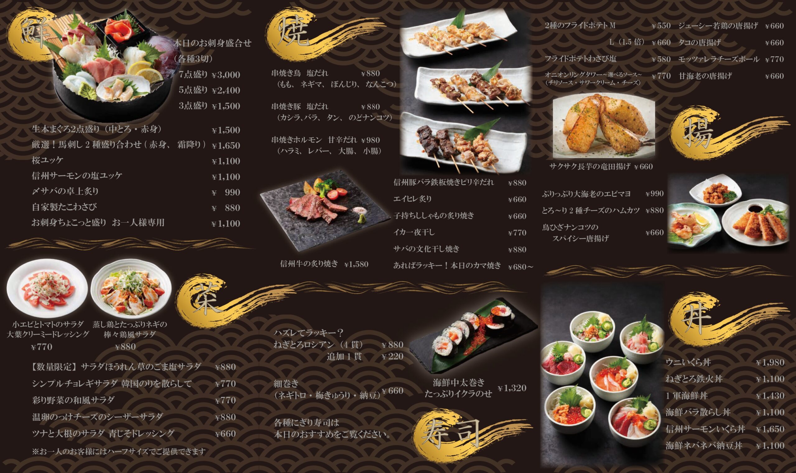 佐久平駅前にある海鮮ダイニングです。季節の魚と野菜と肉を斬新に、新鮮素材を融合した料理が豊富に揃っています。