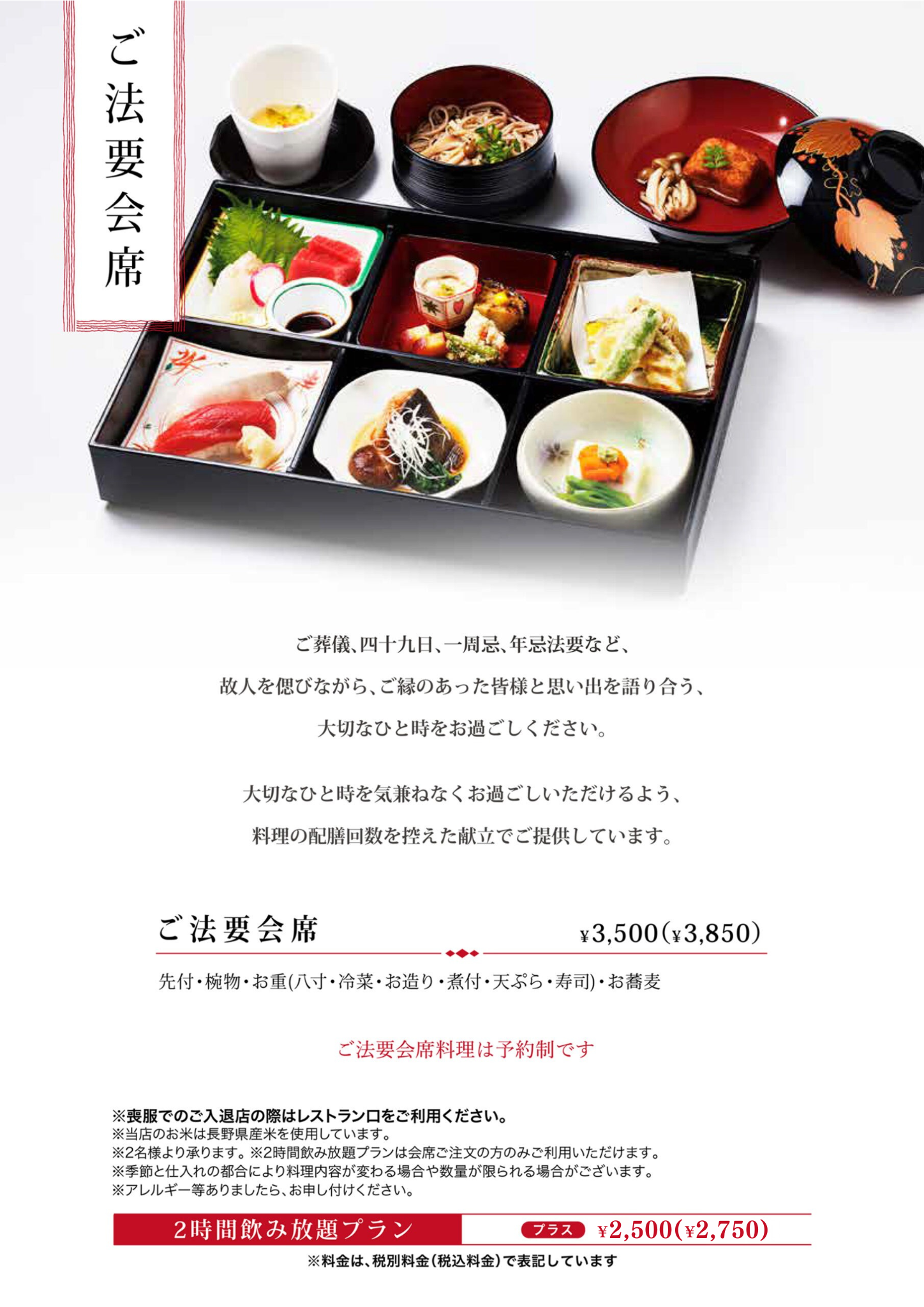 市場直送の旬の魚介を使ったお寿司と信州蕎麦の両方をお楽しみいただ
